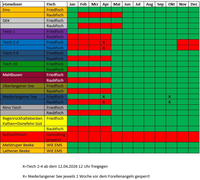 Die nebenstehenden Sperrzeiten der Gewässer müssen von jedem Vereinsmitglied und Gastangler wahrgenommen und eingehaltenwerden.